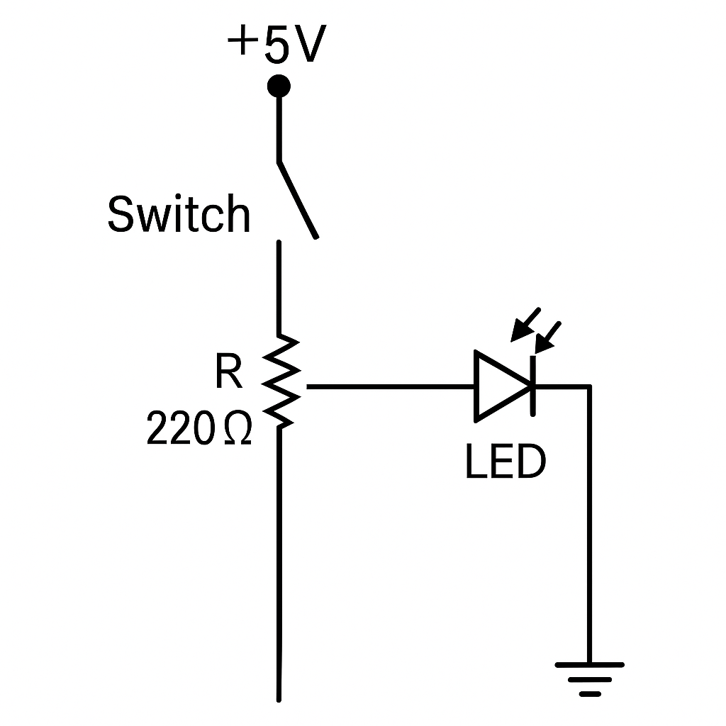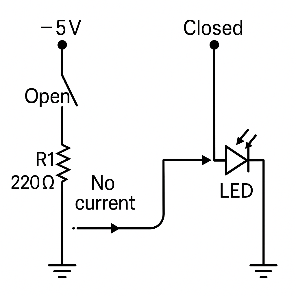 Let’s say we are powering the circuit with a 5V source like an Arduino or a battery. The switch acts like a gate. When it’s open, the current can’t pass through so the LED stays off. When you press the switch, the gate closes and current flows.